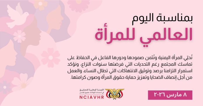 حيّت اللجنة الوطنية للتحقيق في ادعاءات انتهاكات حقوق الإنسان المرأة اليمنية بمناسبة اليوم العالمي للمرأة، مشيدةً بصمودها ودورها الفاعل في الحفاظ على تماسك المجتمع رغم التحديات الكبيرة التي فرضتها سنوات النزاع في البلاد.