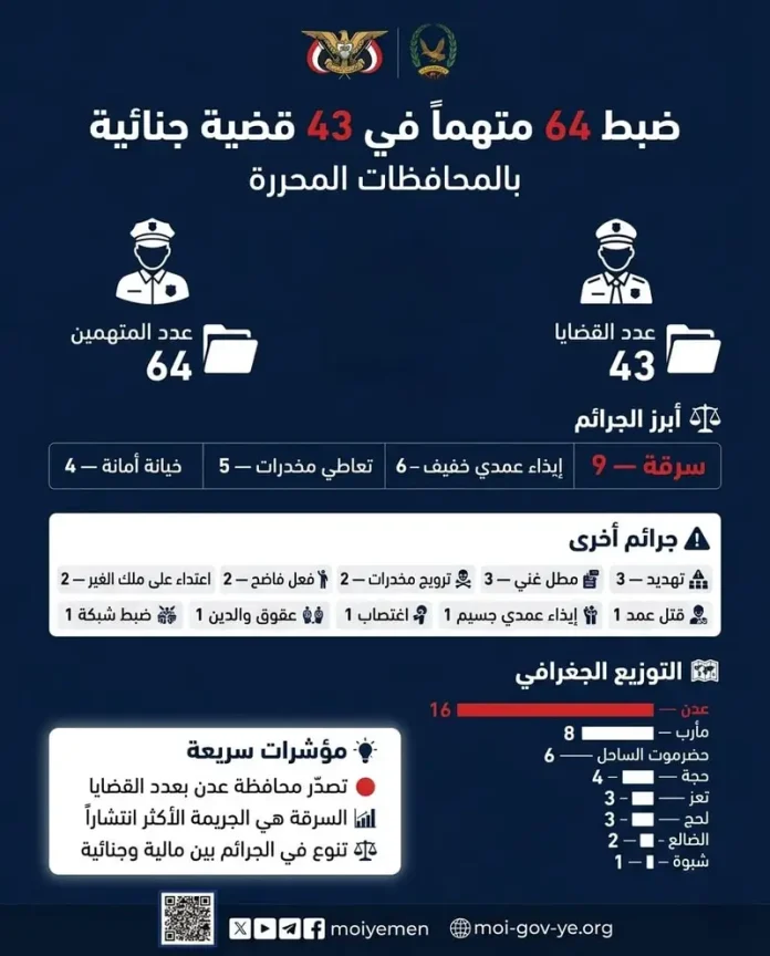 تمكنت أجهزة الشرطة في عدد من المحافظات المحررة من ضبط 64 متهماً على ذمة 43 قضية جنائية متنوعة، وفقاً لما أفاد به الإعلام الأمني التابع لوزارة الداخلية في تقريره الإحصائي الأخير.