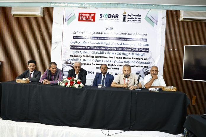 انطلقت في محافظة تعز، السبت، أعمال ورشة تدريبية متخصصة تهدف إلى تعزيز قدرات القيادات النقابية في مجالات حقوق العمال، مهارات التواصل، والتفاوض الجماعي. وتستمر الورشة ثلاثة أيام حتى 20 أبريل الجاري، وينظمها بشكل مشترك مؤسسة أوار للعدالة والتنمية والمرصد الاجتماعي للتنمية والحقوق، بالتعاون مع مؤسسة فريدريش إيبرت الألمانية – مكتب اليمن.