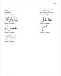 وضمت الرسالة تسعة أعضاء في الكونجرس الأمريكي، هم: شري ثانيدار، جوناثان ل. جاكسون، ريتشي توريس، شيلا شيرفيلوس-ماكورميك، هنري سي “هانك” جونسون جونيور، سيث مولتون، دارين سوتو، أندريه كارسون، وآل غرين.