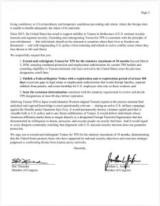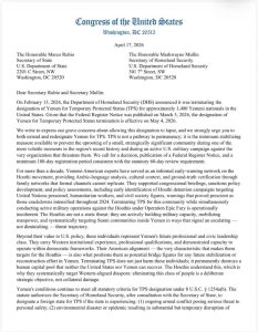 http://In cooperation and coordination with the Washington Center for Yemeni Studies, a letter from members of Congress calls for extending and redesignating Temporary Protected Status (TPS) for Yemenis