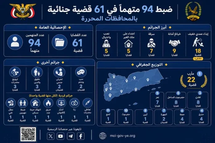 أعلنت الأجهزة الأمنية في عدد من المحافظات المحررة ضبط 94 متهماً على ذمة 61 قضية جنائية متنوعة، وذلك وفق التقرير الإحصائي الصادر عن الإدارة العامة للقيادة والسيطرة بوزارة الداخلية، ونشره الإعلام الأمني التابع لوزارة الداخلية.