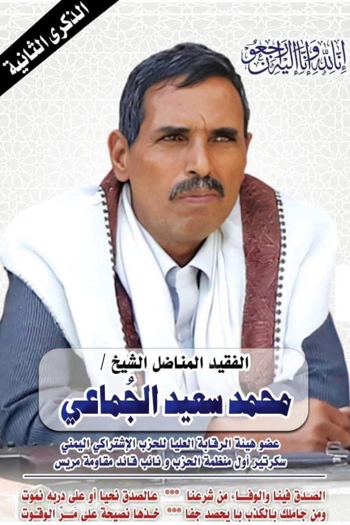 دعت منظمة الحزب الاشتراكي اليمني في مديرية مريس بمحافظة الضالع، بالتنسيق مع مجلس مقاومة مريس، إلى تنظيم ندوة سياسية وأدبية إحياءً للذكرى الثانية لرحيل المناضل محمد سعيد الجماعي، الذي شغل عضوية الهيئة العليا للرقابة والتفتيش المالي للحزب، وسكرتير أول منظمة الحزب في المديرية، ونائب رئيس مجلس مقاومة مريس.