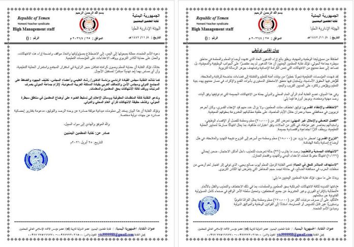 وختمت النقابة بيانها بدعوة المنظمات الحقوقية ووسائل الإعلام لتسليط الضوء على معاناة المعلمين في مناطق الحوثيين، مؤكدة أن بياناتها مبنية على توثيق ميداني وتقارير جهات مختصة.
