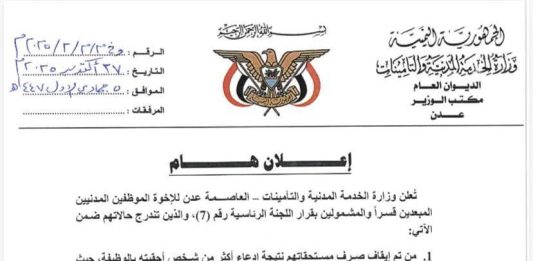 الخدمة المدنية تدعو الموظفين المدنيين المبعدين قسراً إلى مراجعتها لتصحيح أوضاعهم الوظيفية