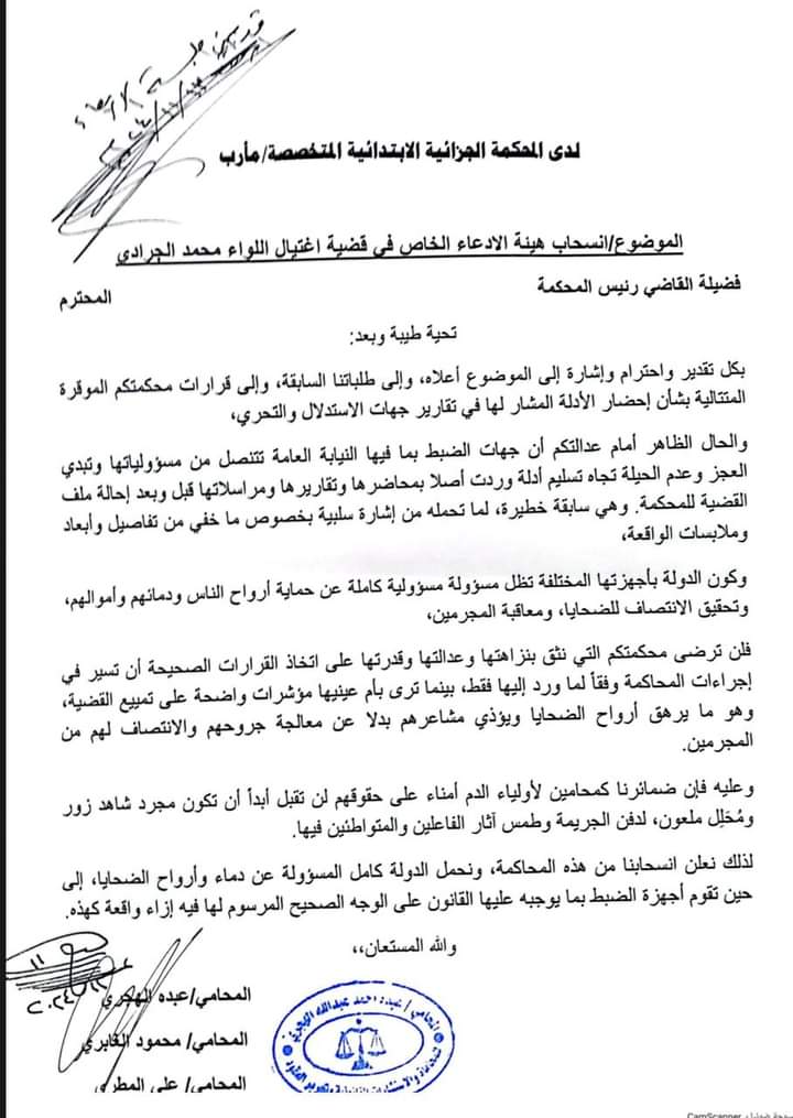أعلنت هيئة الادعاء الخاص في قضية اغتيال اللواء محمد الجرادي انسحابها من القضية بسبب عدم تجاوب أجهزة الضبط المعنية، وعدم قدرتها على تحمل مسؤولياتها تجاه جمع الأدلة المتعلقة بالجريمة. جاء ذلك في رسالة وجهتها الهيئة إلى القاضي رئيس المحكمة الجزائية الابتدائية المتخصصة في محافظة مأرب.
