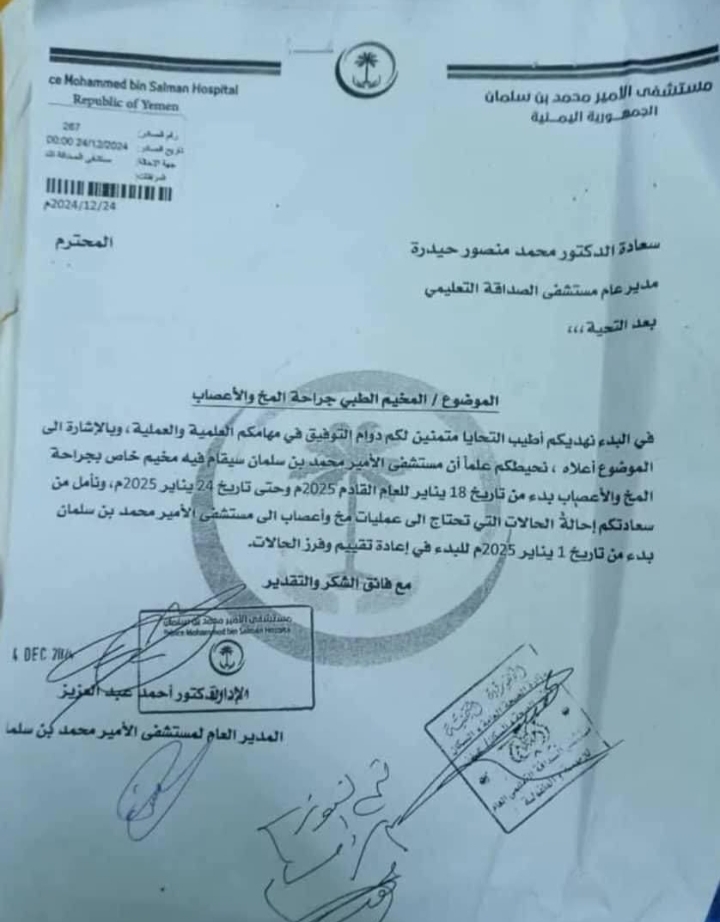 أعلن مستشفى محمد بن سلمان (مستشفى عدن سابقاً) في العاصمة المؤقتة عدن، عن تنظيم مخيم مجاني لجراحة المخ والأعصاب، يبدأ من 18 يناير 2025م ويستمر حتى 24 يناير 2025م.