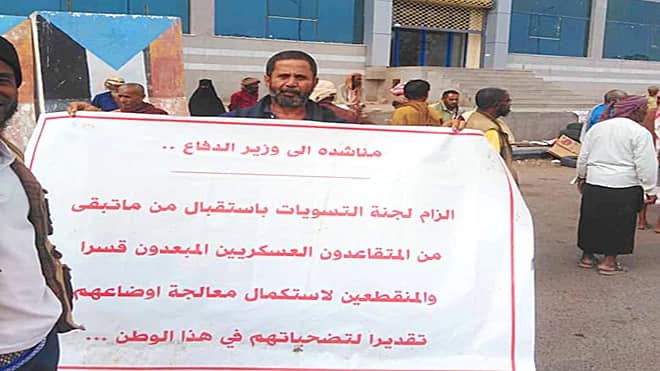 نفذ عشرات المتقاعدين العسكريين الجنوبيين والمبعدين قسراً وقفة احتجاجية، أمس الأحد، أمام بوابة قصر معاشيق في العاصمة المؤقتة عدن، للمطالبة بتسوية أوضاعهم وصرف مستحقاتهم المالية. وأكد المحتجون استمرار تصعيدهم حتى الاستجابة لمطالبهم.