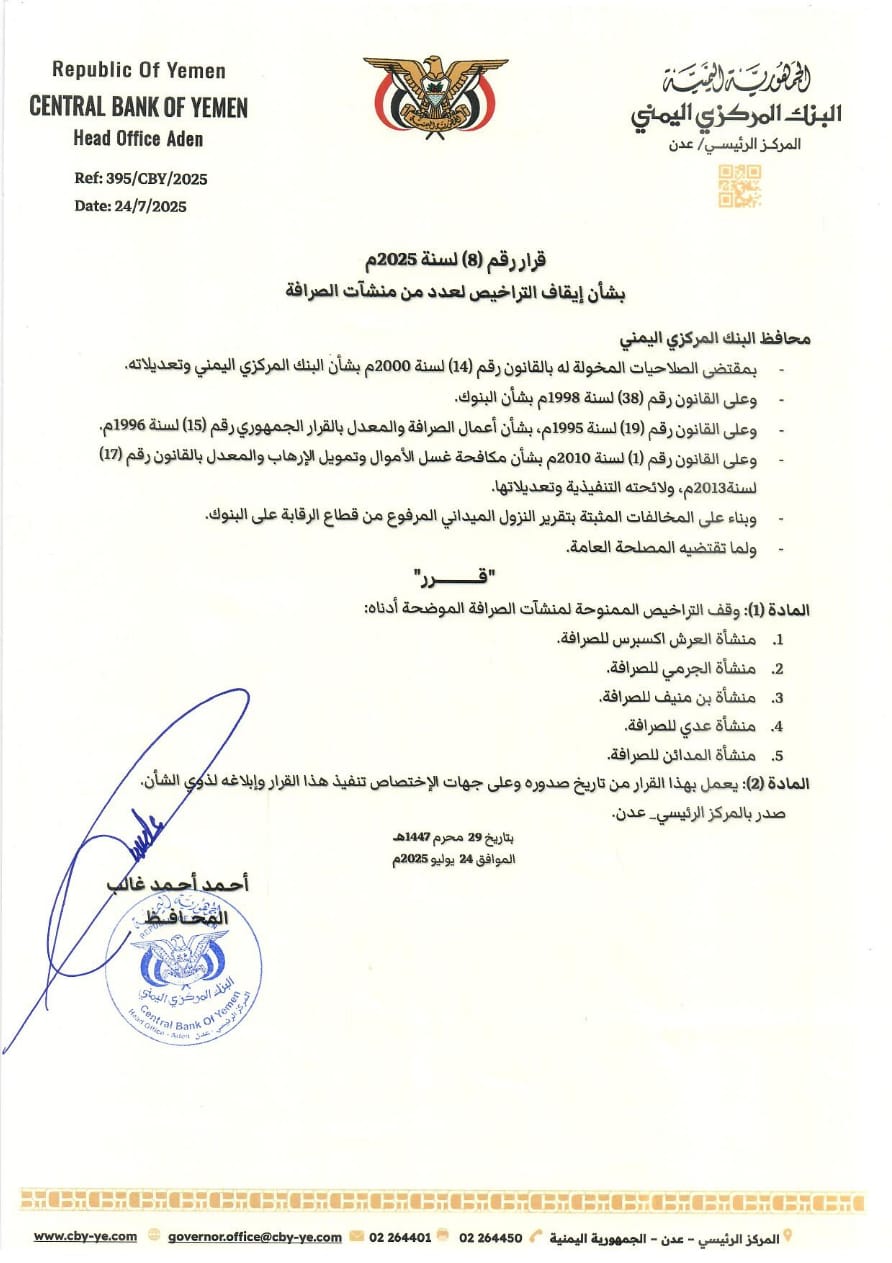 وأوضح البنك في قراره رقم (8) لسنة 2025، الذي وقعه المحافظ أحمد أحمد غالب المعبقي، أن الإجراء شمل كلاً من: منشأة العرش إكسبرس، الجرمي، بن منيف، عدي، والمدائن للصرافة.