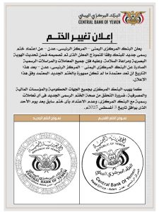 وأوضح البنك، في بيان رسمي، أن جميع المعاملات والمراسلات الصادرة عن مقره الرئيسي في العاصمة المؤقتة عدن لن تكون سارية أو معتمدة بعد تاريخ هذا الإعلان، ما لم تكن ممهورة بالختم الجديد المعتمد.