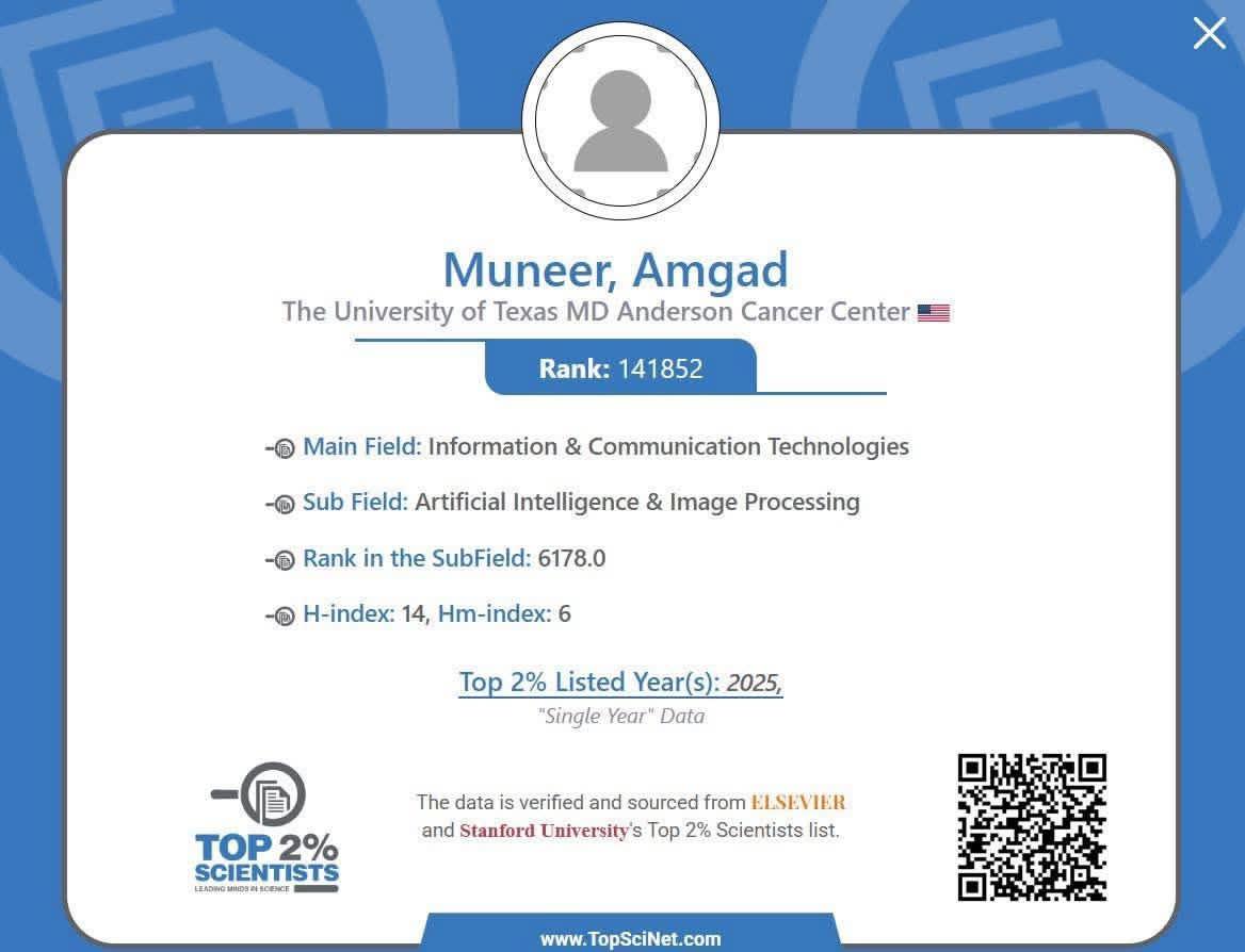 اختير العالم اليمني–الأمريكي أمجد منير الشوافي ضمن قائمة أفضل 2% من العلماء على مستوى العالم لعام 2025 في مجال الذكاء الاصطناعي ومعالجة الصور، وفق تصنيف جامعة ستانفورد الأمريكية بالتعاون مع دار النشر العلمية “إلسيفير”.