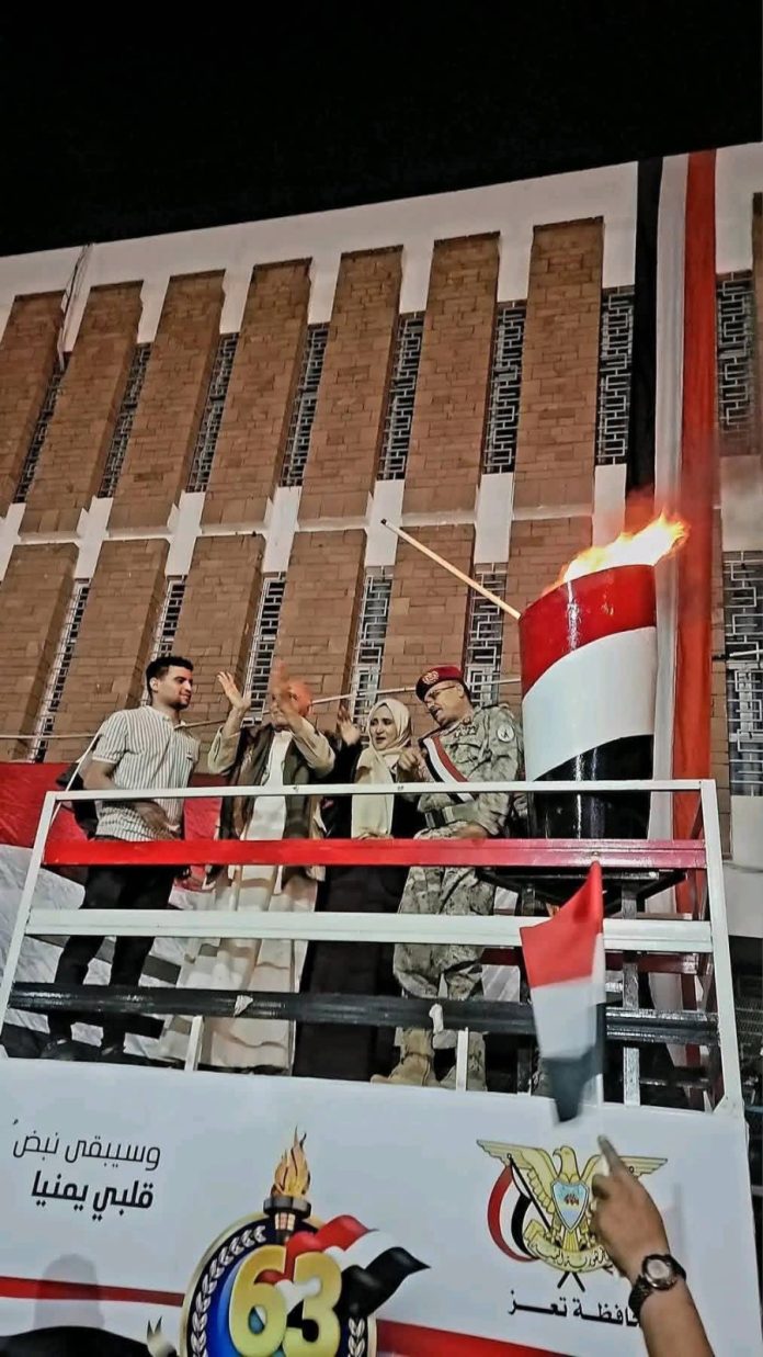 أوقد والد الشهيدة افتهان المشهري، مديرة صندوق النظافة والتحسين التي اغتيلت الأسبوع الماضي، مساء الخميس، شعلة الذكرى الـ63 لثورة 26 سبتمبر المجيدة في شارع جمال بمدينة تعز.