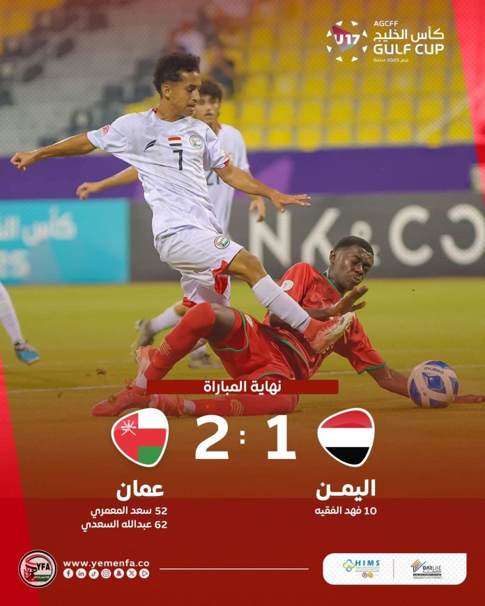 أنهى المنتخب الوطني للناشئين مشواره في بطولة كأس الخليج، المقامة حالياً في العاصمة القطرية الدوحة خلال الفترة من 20 سبتمبر وحتى 3 أكتوبر، بخسارة أمام نظيره العُماني بهدفين مقابل هدف، في اللقاء الذي جمعهما مساء السبت على استاد سحيم بن حمد بنادي قطر ضمن منافسات الجولة الثالثة للمجموعة الأولى التي تضم أيضاً قطر والإمارات.
