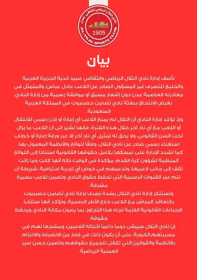 أعربت إدارة نادي التلال الرياضي والثقافي، الثلاثاء، عن أسفها لمغادرة اللاعب عادل عباس العاصمة المؤقتة عدن والانضمام إلى بعثة نادي تضامن حضرموت في السعودية دون إذن أو إعارة رسمية، مؤكدة أن اللاعب ما يزال تحت السن القانوني.