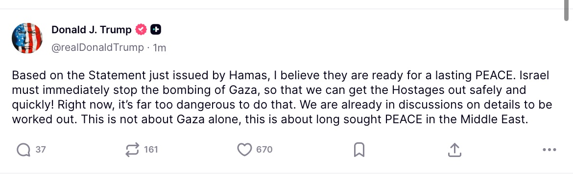 وقال ترمب، في تصريح عبر منصته “تروث سوشيال”: “بناءً على البيان الصادر عن حماس، أعتقد أنهم مستعدون لسلام دائم، ويجب على إسرائيل التوقف فورًا عن قصف غزة، حتى نتمكن من إطلاق سراح الرهائن بأمان وسرعة”. وأضاف أن “الوضع حاليًا خطير جداً، ونعمل على مناقشة تفاصيل يجب الاتفاق عليها، إذ إن الأمر لا يقتصر على غزة فحسب، بل يتعلق بتحقيق السلام الذي طال انتظاره في المنطقة”.