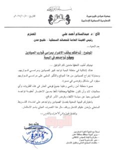 ووجهت الجمعية نسخة من المذكرة إلى وزير الدولة محافظ العاصمة المؤقتة عدن، وسكرتارية قيادة المجلس الانتقالي، ومدير عام مديرية صيرة، ومنظمات المجتمع المدني وحقوق الإنسان، داعية إلى التدخل السريع لوقف أي إجراءات قد تمس بحقوق الصيادين أو تعرّضهم للأضرار.