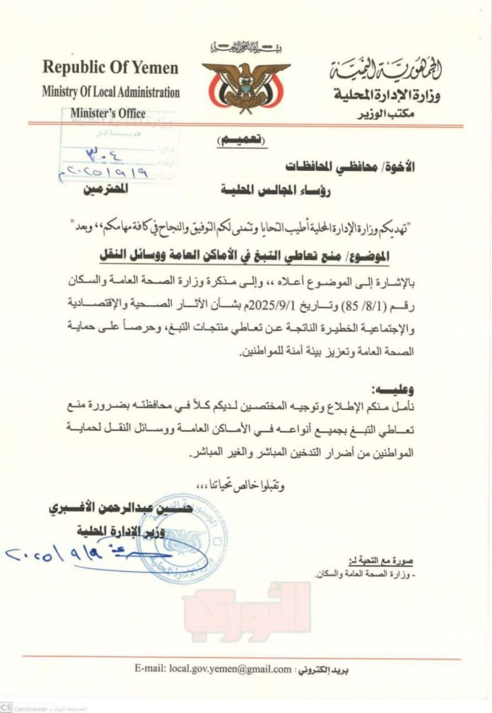 وجهت الحكومة اليمنية، ممثلة بوزارة الإدارة المحلية، السلطات المحلية في المحافظات الواقعة تحت إدارة الشرعية، بتنفيذ حظر شامل على التدخين في الأماكن العامة، وذلك في خطوة تهدف إلى حماية الصحة العامة والحد من أضرار التبغ.