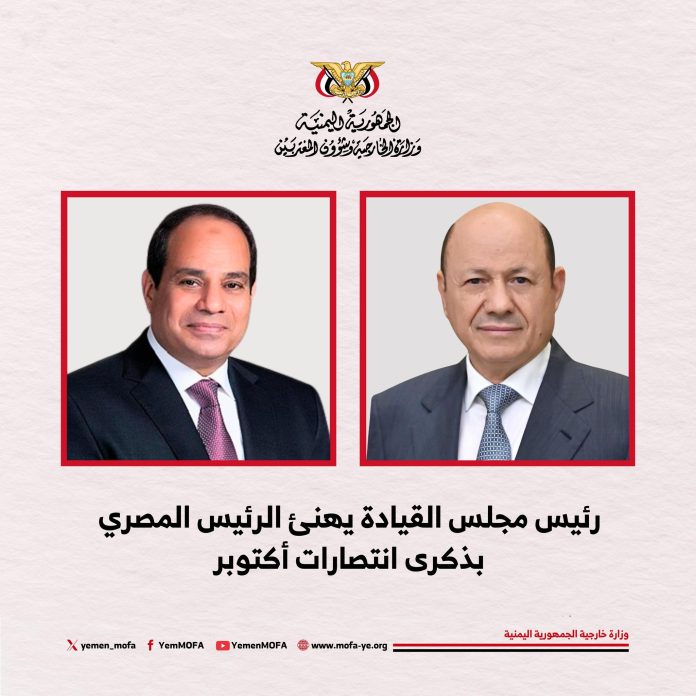 بعث رئيس مجلس القيادة الرئاسي رشاد العليمي، برقية تهنئة إلى الرئيس المصري عبدالفتاح السيسي، بمناسبة الذكرى الثانية والخمسين لحرب أكتوبر.