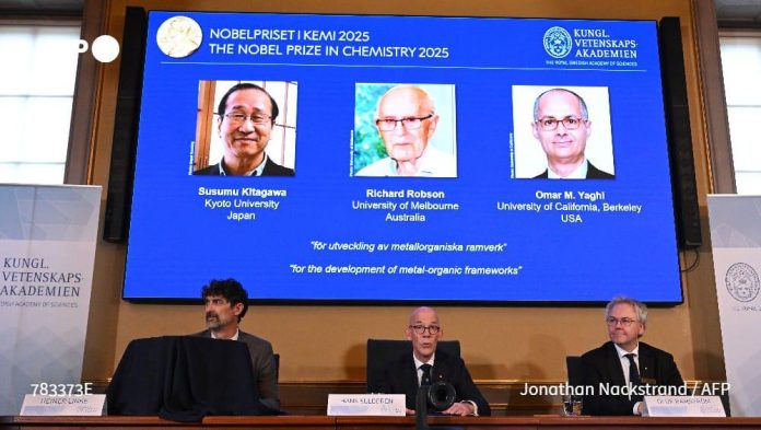 أعلنت الأكاديمية الملكية السويدية للعلوم، اليوم الأربعاء، منح جائزة نوبل في الكيمياء لعام 2025 لثلاثة من العلماء هم الياباني سوسومو كيتاغاوا من جامعة كيوتو، والأسترالي ريتشارد روبسون من جامعة ملبورن، والأردني الأميركي عمر محمد ياغي من جامعة كاليفورنيا في بيركلي بالولايات المتحدة، تقديرًا لإسهاماتهم الرائدة في تطوير الأطر المعدنية العضوية (Metal-Organic Frameworks)، وهي نوع من الهياكل الجزيئية التي أحدثت تحولًا نوعيًا في مجالات متعددة من العلوم التطبيقية.