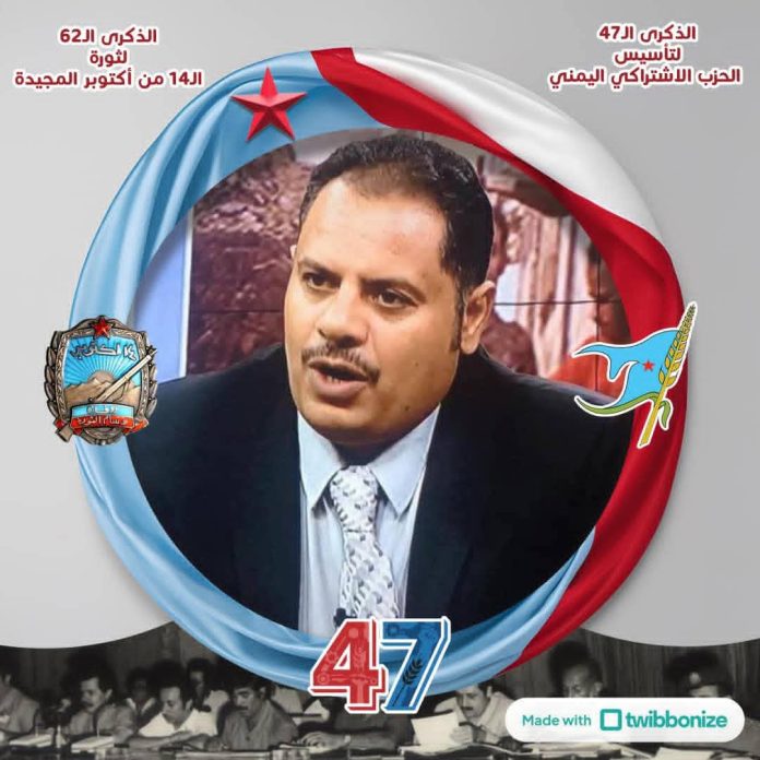 في غمرة احتفالات شعبنا بأعياد الثورة اليمنية سبتمبر وأكتوبر الخالدتين من كل عام، يأتي احتفاء قيادة وقواعد الحزب الاشتراكي اليمني بذكرى تأسيسه، والتي نشهدها اليوم في عامها السابع والأربعين. وبهذا اليوم المجيد، الذي نُهني فيه الأمين العام للحزب الاشتراكي اليمني الدكتور عبدالرحمن عمر السقاف، وكافة أعضاء الأمانة العامة واللجنة المركزية والمكتب السياسي، وكل الرفاق من القيادات الفرعية وجميع أعضاء الحزب في عموم الوطن وخارجه.