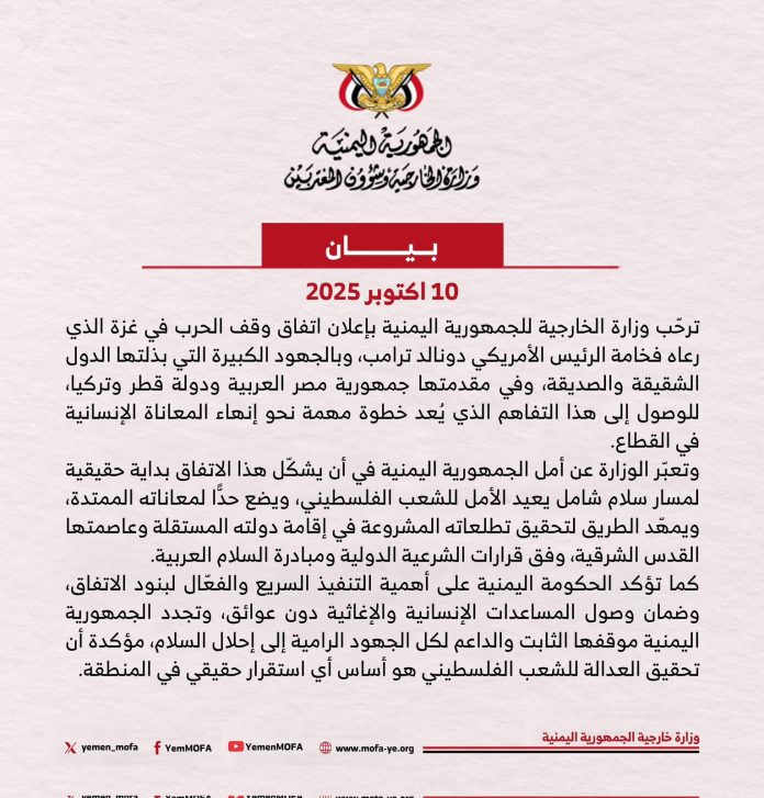 رحبت وزارة الخارجية وشؤون المغتربين في الجمهورية اليمنية، اليوم الجمعة، باتفاق وقف الحرب في قطاع غزة الذي تم برعاية الرئيس الأمريكي دونالد ترامب والجهود الكبيرة التي بذلتها دول شقيقة وصديقة، وفي مقدمتها جمهورية مصر العربية ودولة قطر وتركيا.