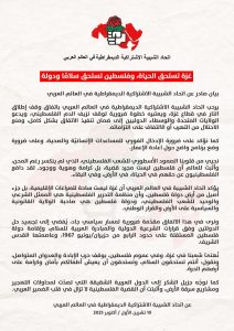 واختتم اتحاد الشبيبة الاشتراكية الديمقراطية بيانه بتوجيه الشكر للدول العربية الشقيقة التي تصدت لمحاولات التهجير والمشاريع لسرقة الأرض، مشدداً على أن “القضية الفلسطينية لا تزال في قلب الضمير العربي”.