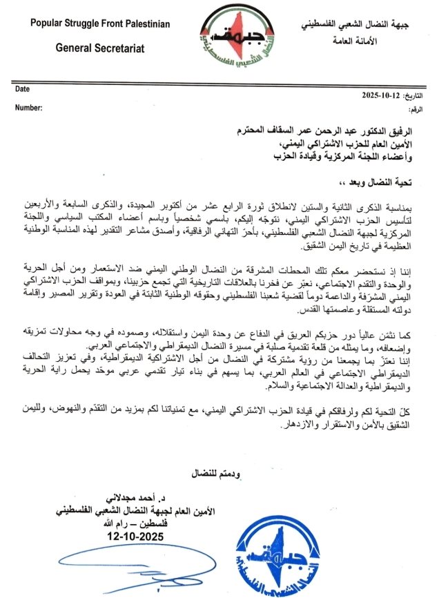 بعثت الأمانة العامة لجبهة النضال الشعبي الفلسطيني برئاسة الأمين العام الدكتور أحمد مجدلاني، برقية تهنئة إلى الدكتور عبد الرحمن عمر السقاف الأمين العام للحزب الاشتراكي اليمني وأعضاء قيادته، بمناسبة الذكرى الثانية والستين لثورة الرابع عشر من أكتوبر، والذكرى السابعة والأربعين لتأسيس الحزب.