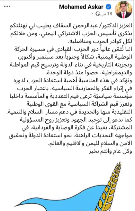 قدم وزير حقوق الإنسان السابق، محمد عسكر، تهنئته للأمين العام للحزب الاشتراكي اليمني الدكتور عبدالرحمن عمر السقاف وقيادة وكوادر الحزب الاشتراكي اليمني بمناسبة الذكرى الـ 47 لتأسيس الحزب، مشيداً بالدور القيادي للحزب في مسيرة الحركة الوطنية اليمنية شمالًا وجنوبًا بعد ثورتي سبتمبر وأكتوبر، وتجربته التاريخية في بناء الدولة وترسيخ قيم المواطنة والديمقراطية، خصوصًا منذ قيام الوحدة اليمنية.