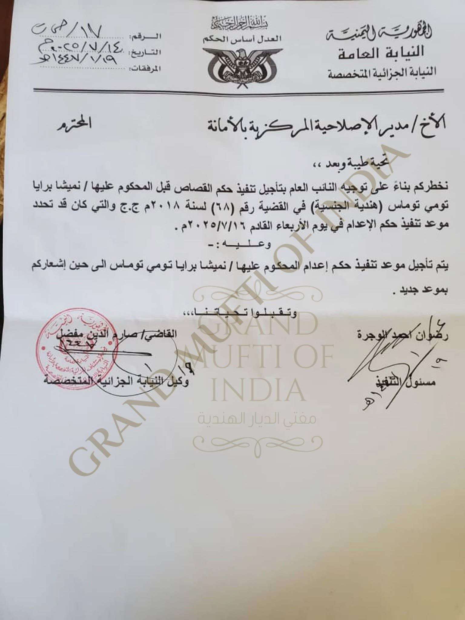 وقالت صحيفة هندوستات تايمز إن سلطات الحوثيين في العاصمة صنعاء كانت تستعد لتنفيذ الحكم يوم الأربعاء، قبل أن يتم تأجيل التنفيذ في اللحظة الأخيرة إثر مساعٍ من الحكومة الهندية وعدد من العلماء والوجهاء اليمنيين.