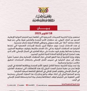 وأضاف البيان أن هذه الممارسات تمثل “تصعيداً خطيراً واستمراراً للنهج العدائي الذي تنتهجه المليشيا تجاه المنظمات الإنسانية”، مشيراً إلى أن الجماعة تسعى من خلال ذلك إلى “تسييس العمل الإنساني واستغلال المساعدات لتحقيق مكاسب سياسية وعسكرية”.