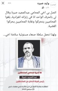 وقال المركز في بيان نشره على حسابه في منصة إكس (تويتر سابقاً)، إن شقيقه وليد صبرة تلقى المكالمة من رقم مجهول، حيث أكد المحامي عبدالمجيد أنه مختطف من قبل جماعة الحوثي ومحتجز في ظروف قاسية، دون أي مسوغ قانوني أو توجيه تهم رسمية.