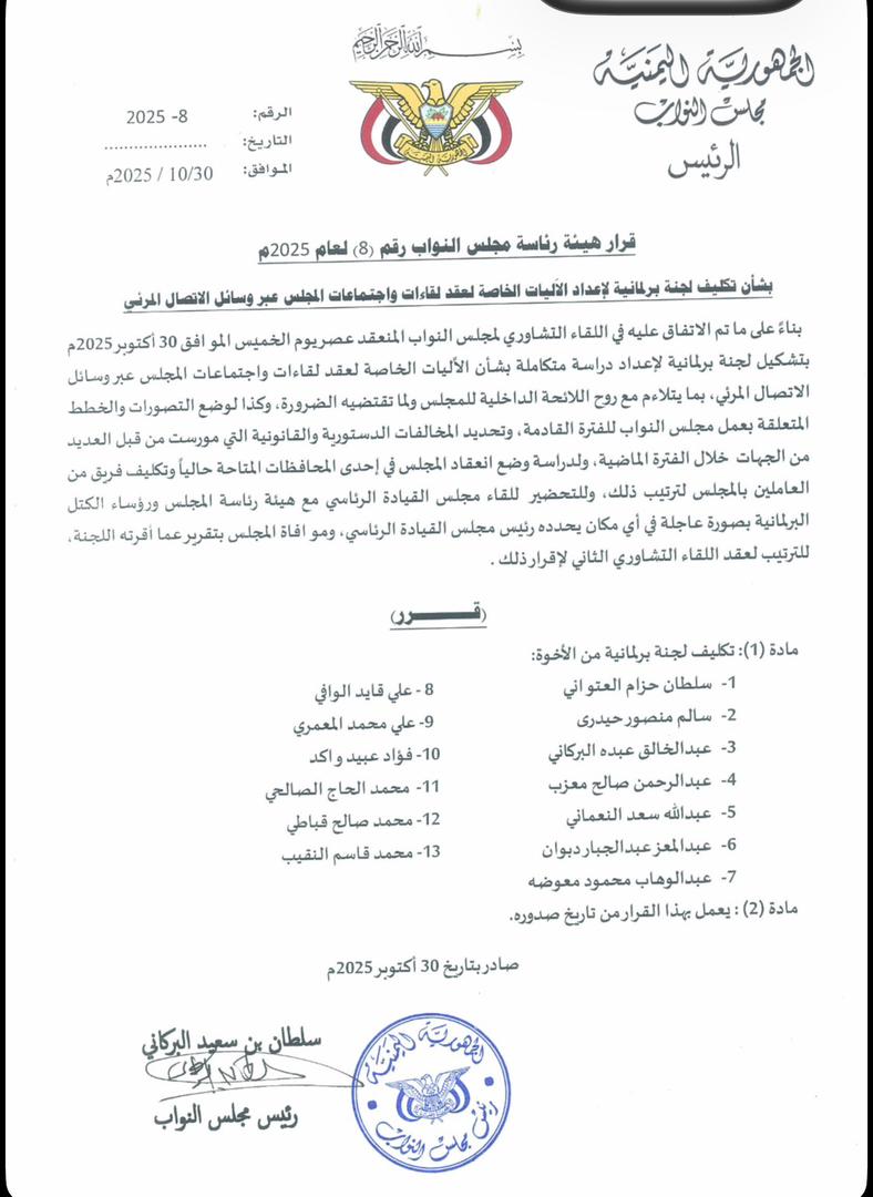 في أعقاب صدور قرار رئيس مجلس النواب الشيخ سلطان البركاني رقم (8) لعام 2025، القاضي بتشكيل لجنة برلمانية لإعداد الآليات الخاصة بعقد اجتماعات المجلس عبر وسائل الاتصال المرئي، أعلن رئيس الكتلة البرلمانية للحزب الاشتراكي اليمني، الدكتور محمد صالح علي، اعتذاره عن المشاركة في اللجنة، موضحًا أن موقف كتلته من هذه الآلية كان واضحًا ومعلنًا منذ البداية.