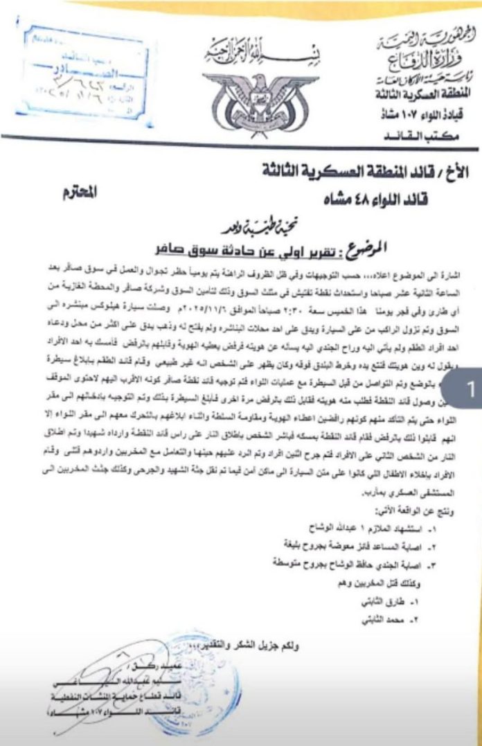 كشفت وثيقة رسمية صادرة عن قيادة اللواء 107 مشاة بمحافظة مأرب، عن تفاصيل الاشتباكات المسلحة التي اندلعت فجر اليوم الخميس في سوق صافر، وأسفرت عن مقتل ثلاثة أشخاص بينهم قائد نقطة عسكرية، وإصابة اثنين من أفراد الجيش.