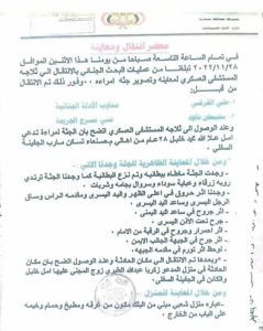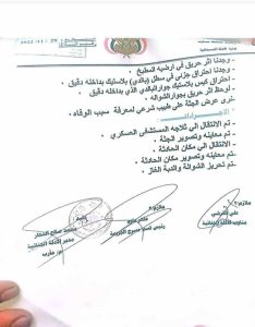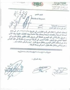 أكد التقرير الطبي الصادر عن مستشفى مأرب العسكري بتاريخ 28/ 11/ 2022م، وصول المتوفاة في تمام الساعة الرابعة والنصف صباحاً.