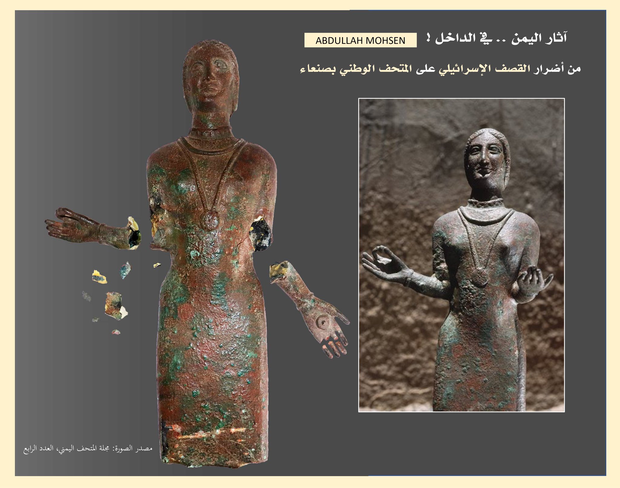 الخبير في شؤون الآثار عبدالله محسن وصف في منشور على صفحته بـ”فيسبوك” الأضرار التي لحقت بتمثال “سيدة البخور” بأنها “مشهد مؤلم”، مشيراً إلى أن التمثال يُعد من روائع البرونز اليمني القديم وأبرز قطع المتحف الوطني، مؤكداً أن “الآثار اليمنية تُدمَّر بفعل القصف والعبث والتهريب ولا حامي لها”.