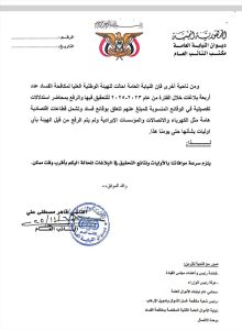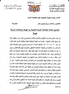 وجّه النائب العام القاضي قاهر مصطفى علي، مذكرة رسمية إلى رئيسة الهيئة الوطنية العليا لمكافحة الفساد القاضية أفراح بادويلان، طالب فيها بسرعة استكمال التحقيق في البلاغات المحالة إلى الهيئة خلال الأعوام 2021 – 2025م، والرد على نتائجها في أقرب وقت ممكن.