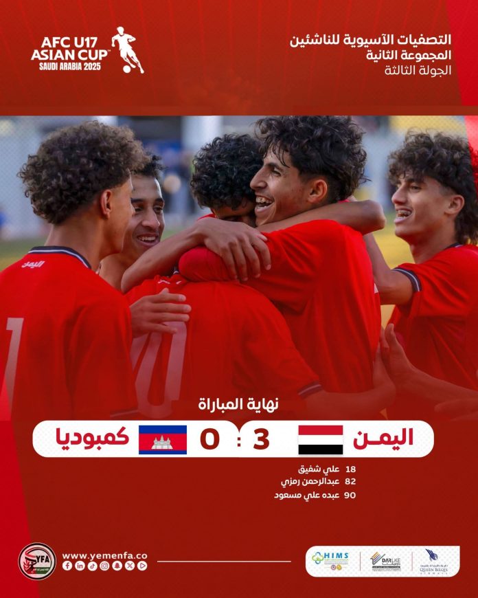 عزّز منتخب اليمن للناشئين تحت 17 عاماً صدارته للمجموعة الثانية في التصفيات المؤهلة لنهائيات كأس آسيا 2026 التي تستضيفها السعودية، بعد فوزه المستحق اليوم على منتخب كمبوديا بثلاثة أهداف دون رد، رافعاً رصيده إلى 9 نقاط بالعلامة الكاملة ودون أن تستقبل شباكه أي هدف حتى الآن.