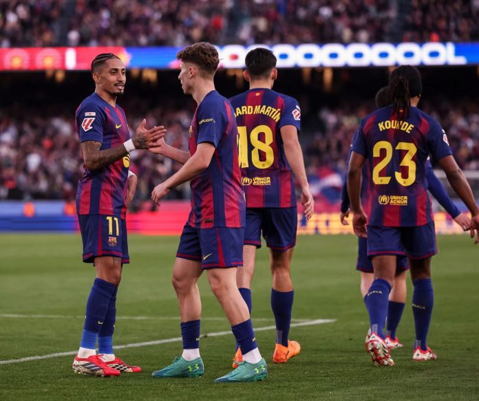 وافتتح مارك برنال التسجيل في الدقيقة الرابعة، قبل أن يضيف فرينكي دي يونغ الهدف الثاني في الدقيقة الـ32، فيما اختتم فرمين لوبيز الثلاثية في الدقيقة الـ81.