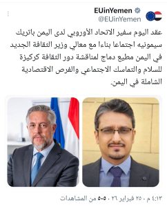 وقال سفير الاتحاد الأوروبي في تغريدة له على منصة “إكس” أنه تم خلال اللقاء بحث سبل تعزيز التعاون بين اليمن والاتحاد الأوروبي في مجالات الثقافة والإبداع، لدعم الاستقرار المجتمعي والتنمية الاقتصادية المستدامة.
